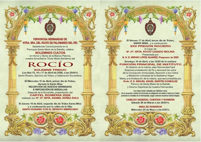 El pregón del Rocío será el 17 de abril, a cargo de Rocío Casado, una vez finalizado el triduo.