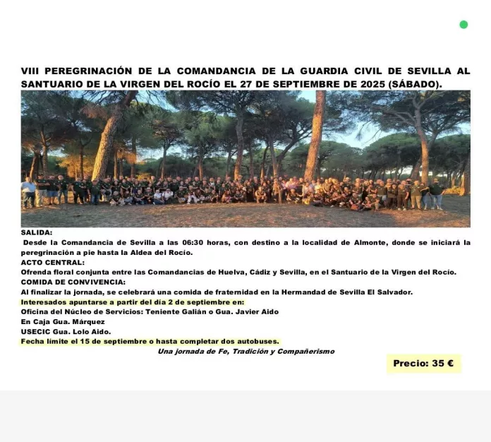 El próximo sábado, 27 de septiembre, tendrá lugar la VIII Peregrinación de la Comandancia de la Guardia civil de Sevilla al Santuario del Rocío.